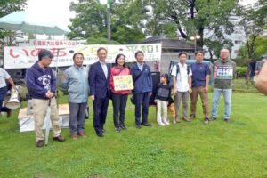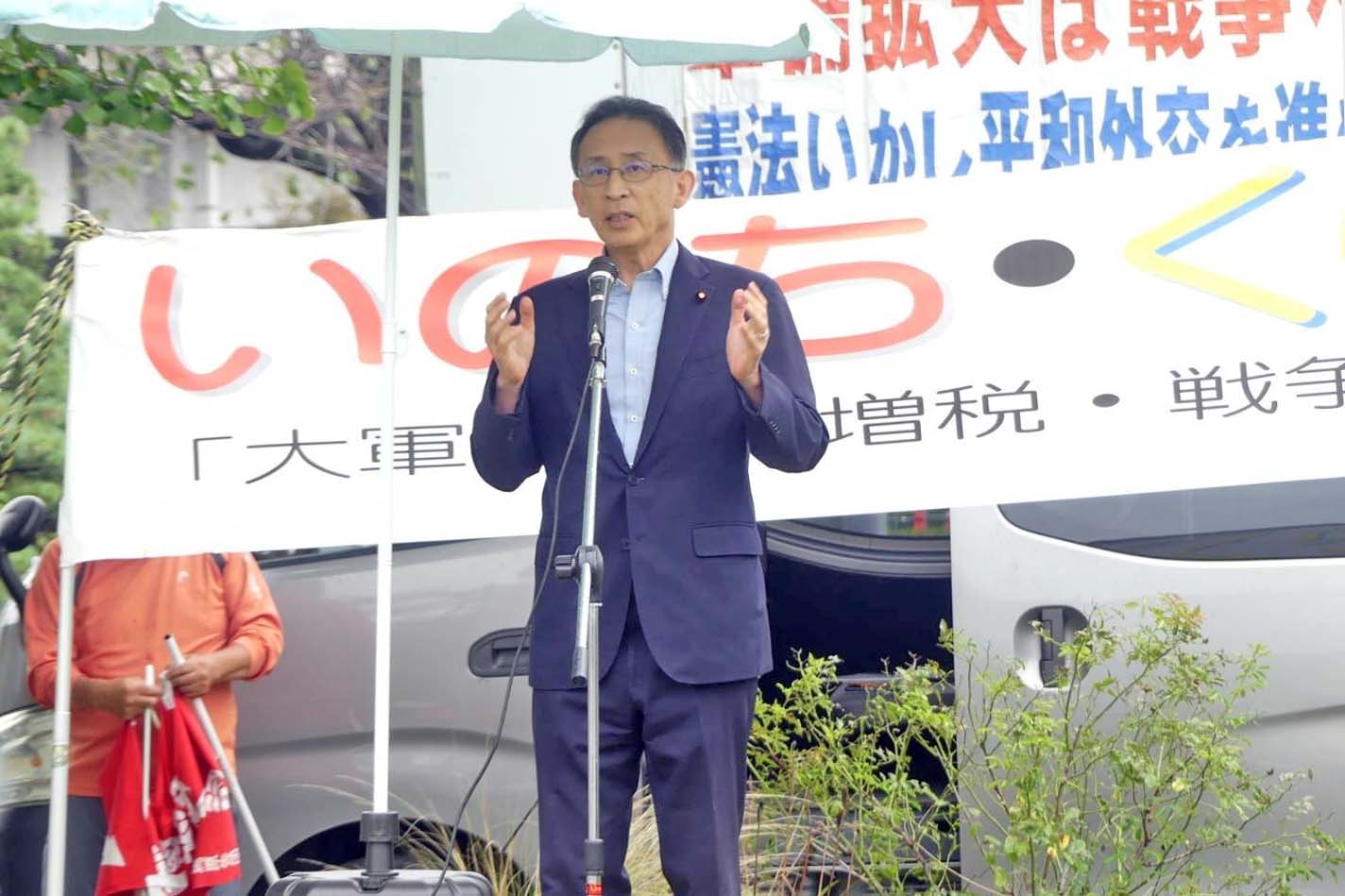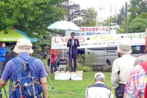 日本共産党の塩川鉄也衆院議員が連帯あいさつし、「日米共同訓練があちこちで行われている。アメリカの要求に沿った大軍拡は断じて許すことはできない。群馬でも日米豪共同訓練や吉井弾薬庫周辺用地の取得など認められない。極右・排外主義の勢力とも皆さんと一緒に闘う」と訴えました。立憲民主党群馬県総支部連合会、社民党群馬県連合、石川眞男玉村町長の連帯メッセージが紹介されました。