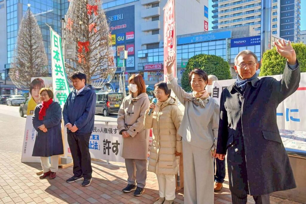 所沢駅西口で新春宣伝行動 2026/01/04 城下県議、所沢市議団と訴え! 物価高騰対策として最も効果のある消費税減税を! この間、儲けを増やした大企業や超富裕層に応分の税の負担を求めるという日本共産党の提案が政治を動かしている。 中小企業支援と一体に、最賃は時給1500円、そして1700円に! 軍拡増税やめよ!