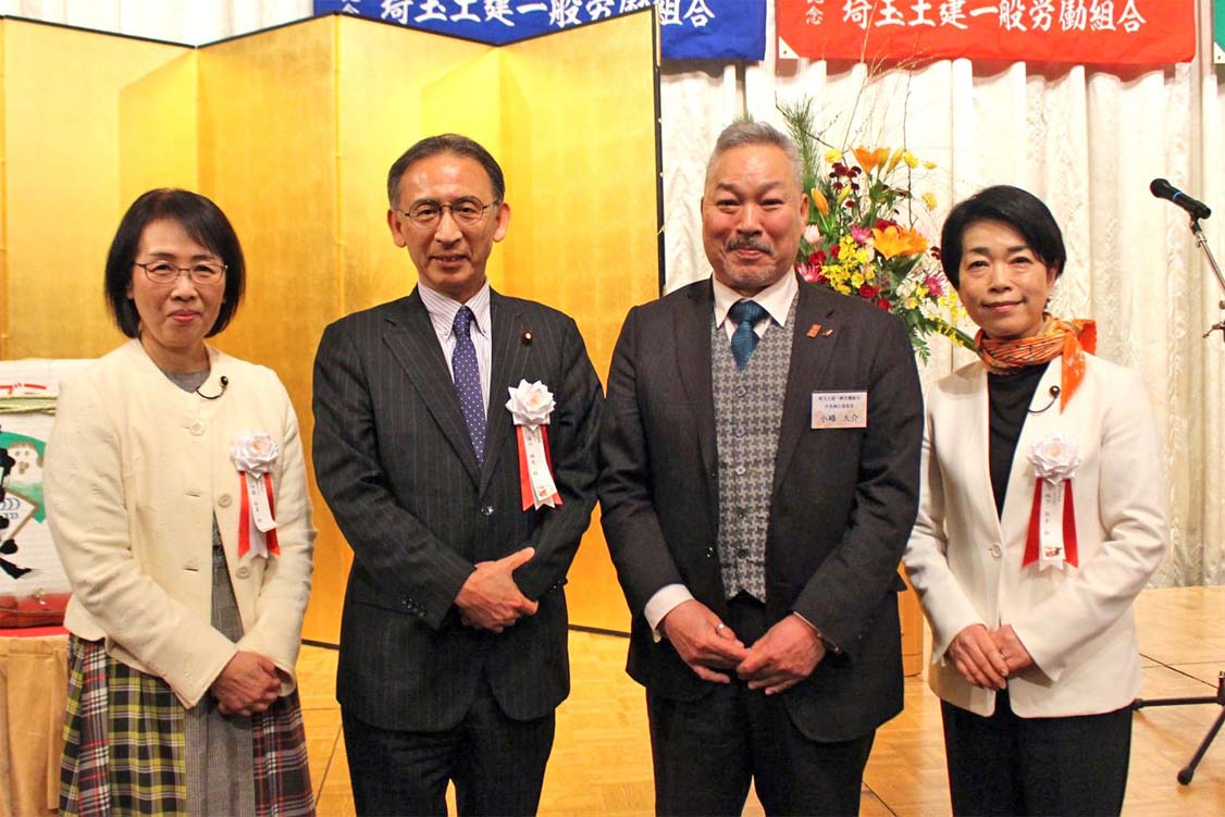 大野元裕県知事や埼玉県労働組合連合会の藤田省吾議長、安保関連法に反対する「オール埼玉総行動実行委員会」の小出重義実行委員長、日本共産党の塩川鉄也国対委員長・衆院議員らが来賓あいさつ。建設労働者の処遇改善などに奮闘する埼玉土建の活動への敬意や、平和と暮らしを守り、従来の健康保険証復活を求める運動などをともに進める決意が語られました。