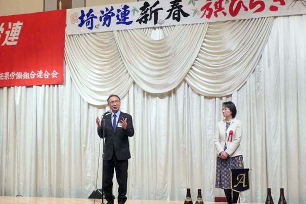 埼労連新春旗開き 2026/01/10 労働者の暮らしと権利、平和・民主主義の先頭に立つ埼労連(藤田省吾議長)の活動に敬意。 実態調査によるさいたま市の最低生計費は時給1810円。 物価高騰の中、「最低賃金時給1500円」の旗を降ろした高市首相では暮らしを守れない。 中小企業支援と一体に1500円、そして1800円めざそう!
