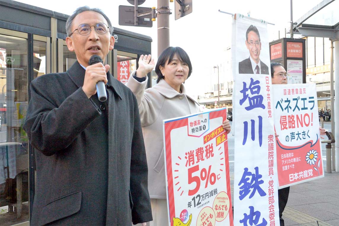 塩川氏は、高市首相がアメリカのベネズエラ侵略にものを言えない姿勢、「台湾有事」発言、統一協会と自民党の癒着などの問題で国会での追及を避けるために衆院を解散するなら「厳しい審判を」と強調。外国人や女性を差別し、高齢者と現役世代の対立をあおるようなやり方ではなく「多くの人と政治を変えるために力を尽くします」と訴えました。
