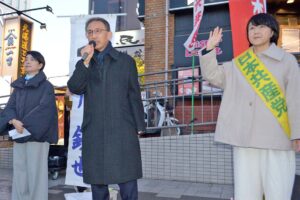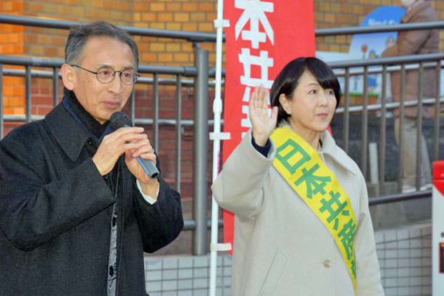 日本共産党の塩川鉄也国対委員長・衆院議員と梅村さえこ衆院北関東比例候補は14日、さいたま市のJR浦和駅東口で宣伝し、解散・総選挙で「比例で共産党を大きく伸ばしてください」と呼びかけました。