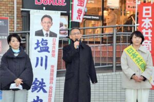 塩川氏は、高市早苗首相が物価高騰対策を最優先にするとしていたにもかかわらず、予算案の審議もせずに通常国会冒頭での衆院解散を狙っていると批判。雇用や暮らし、社会保障、平和などの問題で「総選挙は政治の流れを変える大きなチャンスです」と強調しました。