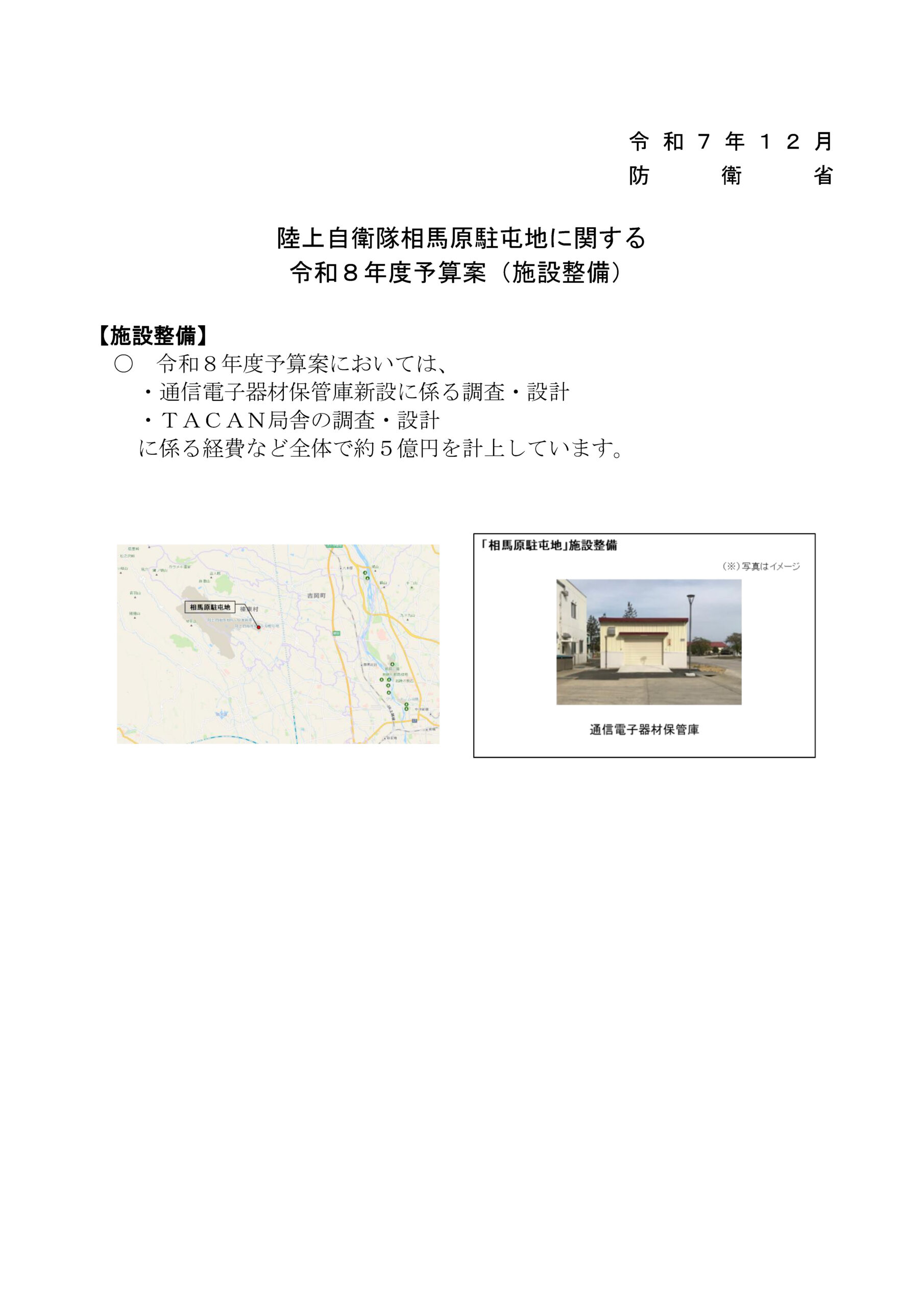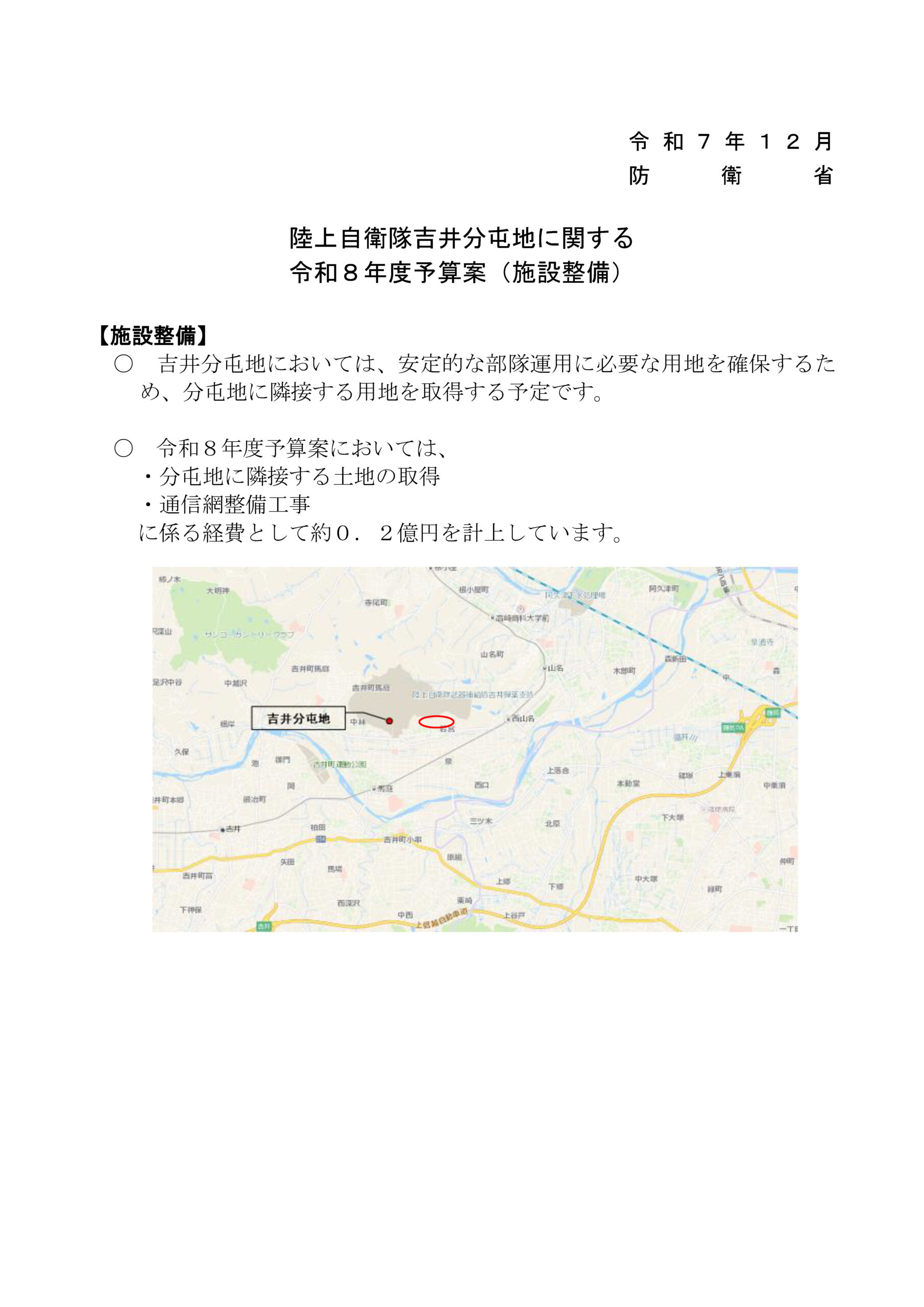 分屯地に隣接する土地の取得にかかる経費(火薬庫をより安定的に運用するため)。通信網整備工事に係る経費(光ケーブル埋設2期工事)。