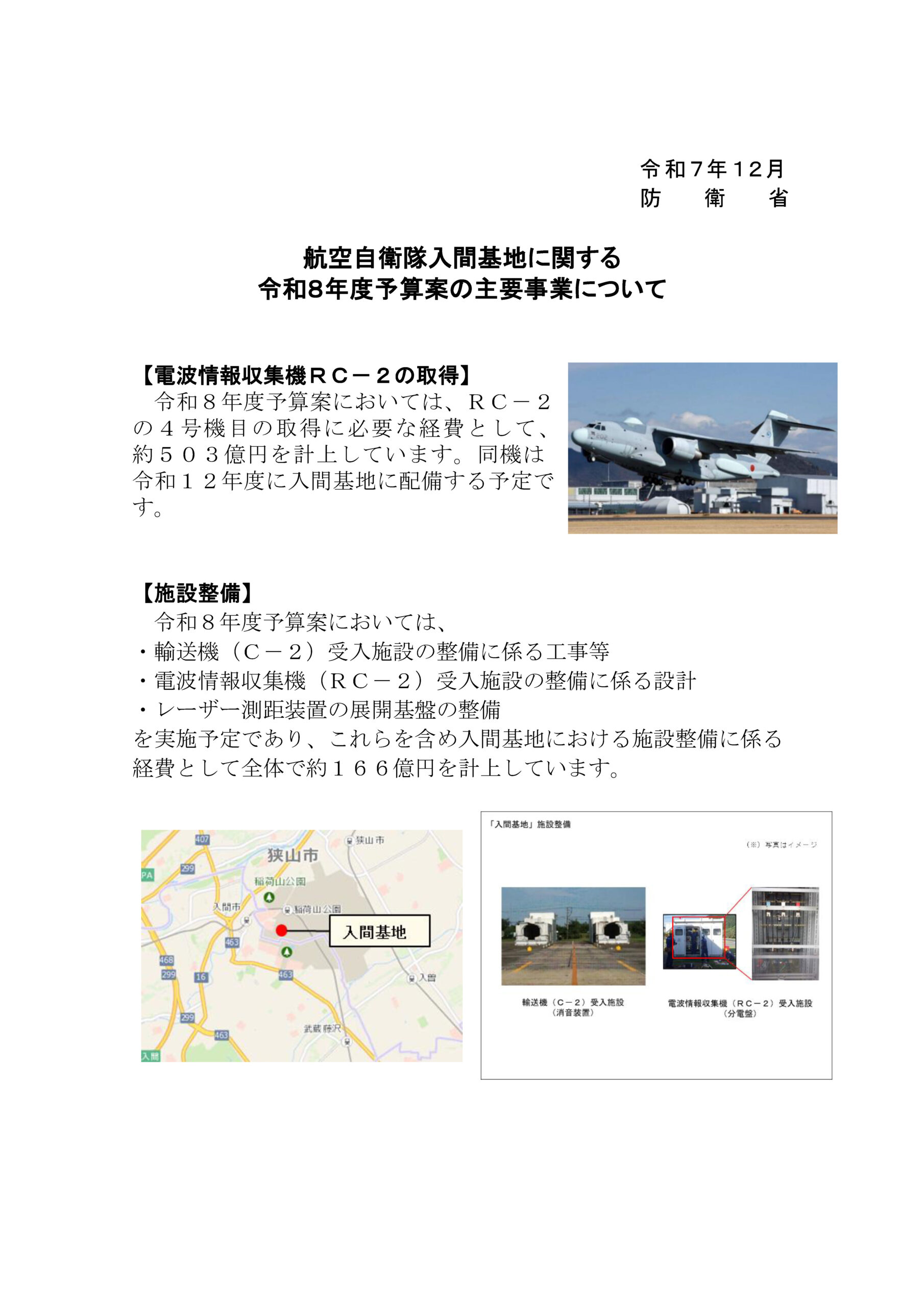 隊庁舎建替3棟132億円。輸送機(C-2)受入施設の整備に係る工事等4億円。レーザー測距装置の展開基盤の整備3億円。電波情報収集機(RC-2)の受入施設の整備に係る設計等。