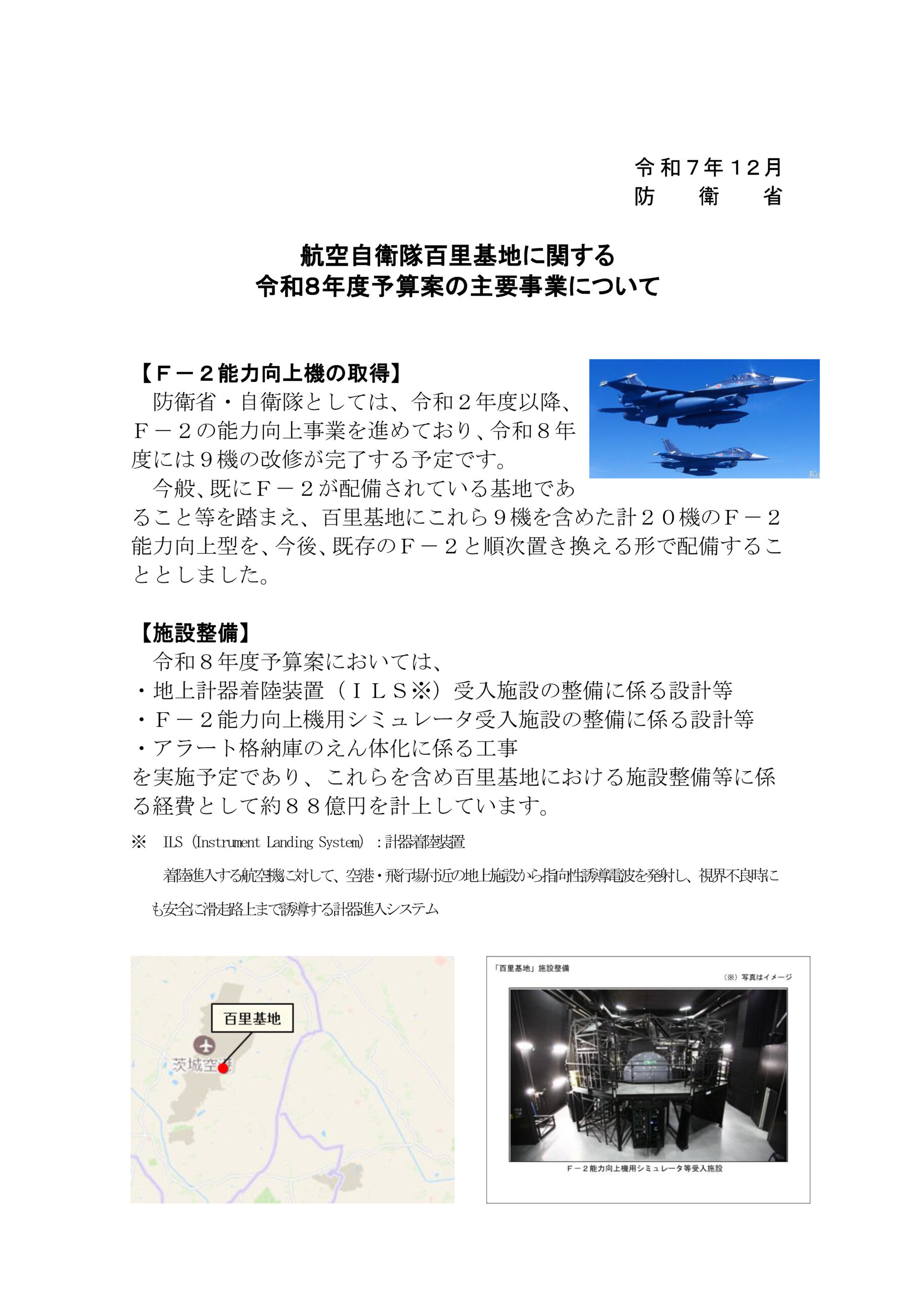 地上計器着陸装置(ILS)受入施設の整備に関する設計等1億円。F-2能力向上機用シミュレーター受入施設の整備に係る設計等1億円。アラート格納庫のえん体化30億円。隊庁舎の整備55億円。