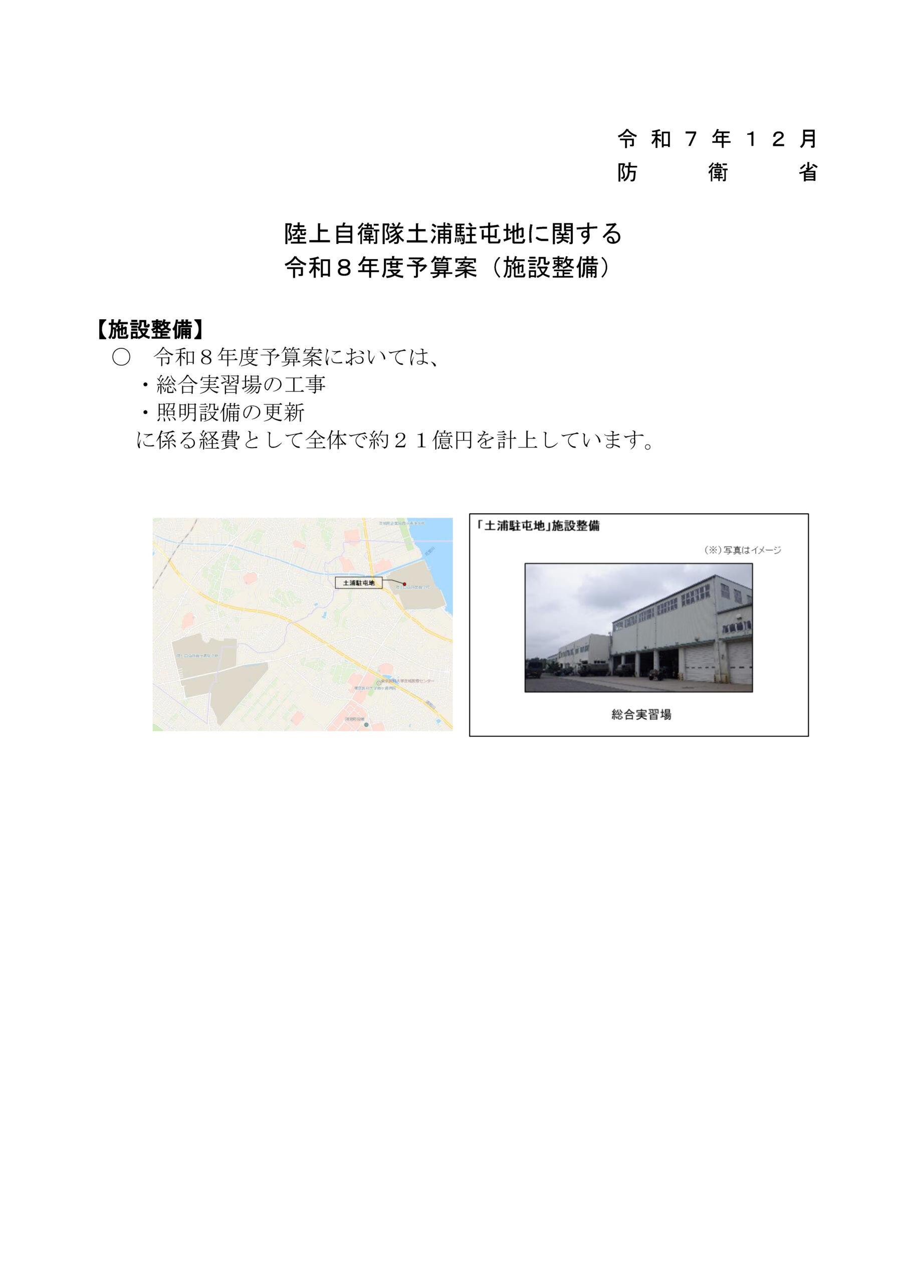 | 2.陸自駐屯地(朝霞・大宮・相馬原・新町・吉井・宇都宮・北宇都宮・勝田・土浦・霞ヶ浦・古河・朝日・習志野・木更津)及び空自基地(百里・熊谷・立川・横田・府中・入間)における「施設整備費」 | |