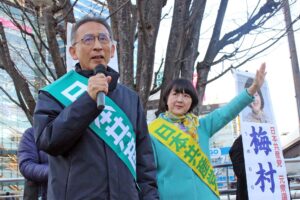 梅村氏は、高市早苗首相が主張する「2年限定の食料品消費税ゼロの検討促進」について「一律に5%減税すれば、インボイス制度も廃止できる。一貫して消貫税減税・廃止へ頑張ってきたのが共産党です」と訴えました。