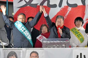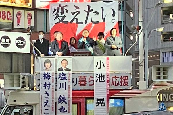 塩川候補は「金権腐敗の高市自維連立政権をただす一番の力は、裏金問題や統一協会との癒着を徹底追及してきた共産党を伸ばすこと。企業・団体献金禁止の論戦の先頭にたってがんばる」と力説。梅村さえこ同比例候補、なえむら京子埼玉14区候補が訴えました。