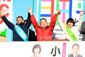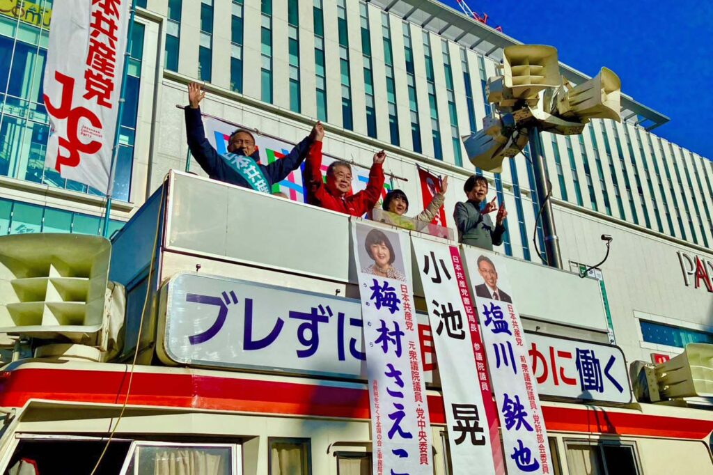 日本共産党の小池晃書記局長は4日、東京、埼玉の3カ所で街頭演説し「比例代表は一票を争う大激戦。日本共産党の議席を必ず勝ち取らせて」と呼び掛けました。比例東京の宮本徹、谷川智行両候補、比例北関東の塩川鉄也、梅村さえこ両候補が訴えました。