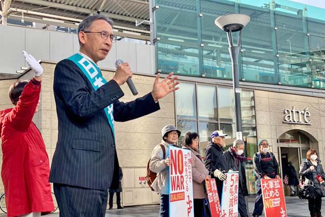 塩川氏は6日、さいたま市内を駆け巡り、「大激戦・大接戦です。支持を広げてほしい」と訴え。高市早苗首相は選挙戦で消費税減税を言わなくなり、財源を明らかにすることもできないとして「大企業や富裕層に応分の負担を求めるなど、財源を示し、消費税減税へ確かな道を開く共産党を伸ばしてください」と呼びかけました。