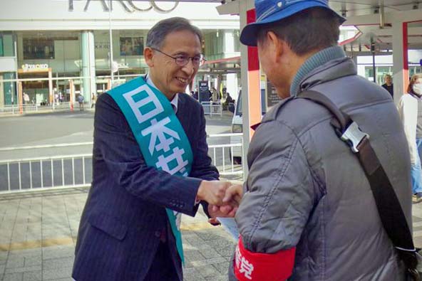 周辺で「しんぶん赤旗」1・2月号外を配っていた鳥海美好(みよし)さん(75)は、4人ほどから「期日前投票で共産党に入れてきました」と声をかけられ、「支持を広げてください」と訴えると、「友達に話します」との反応も。「地域の人たちと対話していても、みんな政治に怒っていて、『こんな時だから共産党頑張って』と言われる。最後まで頑張りたい」と語りました。
