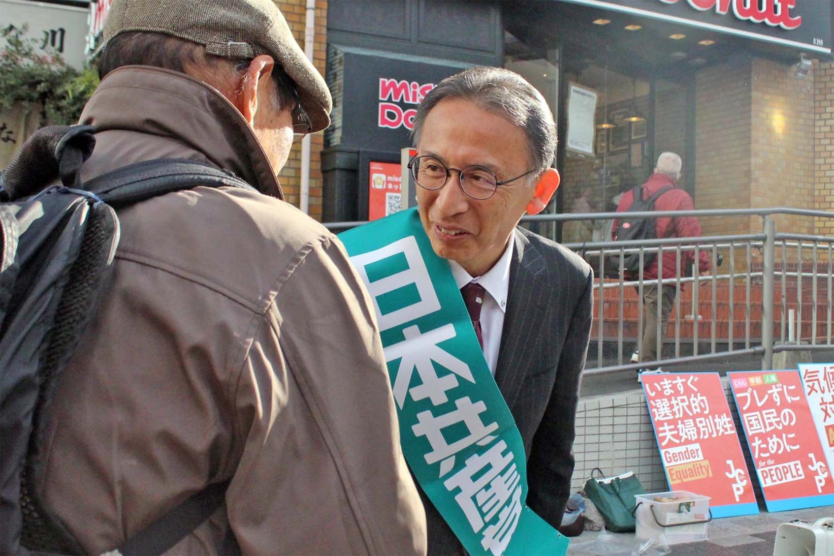 塩川鉄也衆院北関東比例候補(64)=前=は、さいたま市内を駆け巡り、夜には志位和夫議長とともに埼玉県朝霞市で訴えました。選挙戦は大激戦・大接戦だとして「北関東ブロックでは、当落線上で争っています。何としても1議席確保を実現するために、共産党の支持を大きく広げてほしい」と訴えました。