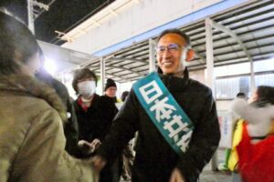 塩川氏は、高市早苗政権が狙う大軍拡や改憲、「台湾有事」発言などを批判し「国連憲章と憲法9条を生かした、絶対に戦争させない政冶の実現へ、全力をあげる共産党を勝たせてください」と呼びかけました。