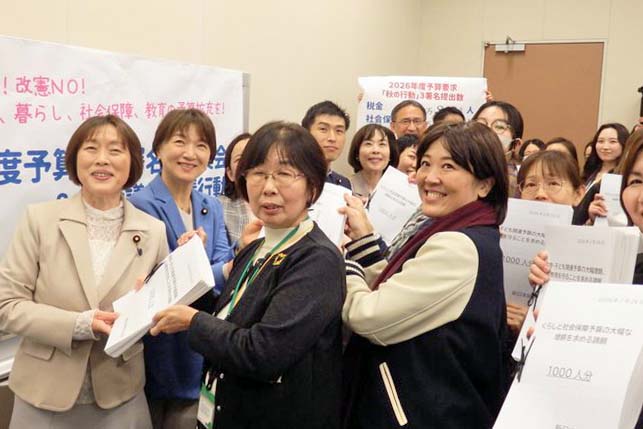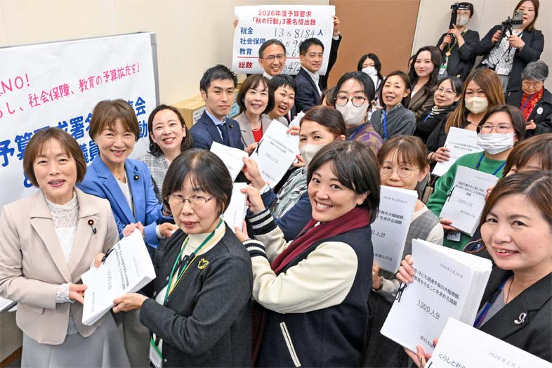 新日本婦人の会(新婦人)は26日、全国から次世代の会員が衆院第1議員会館の会場いっぱいに集まり、熱気に包まれる中、大軍拡・大増税中止・消費税減税、くらし・社会保障、教育の拡充を求める2026年度予算要求の3署名の総計41万4723人分を、日本共産党の田村智子委員長ら衆参議員9人に手渡しました。