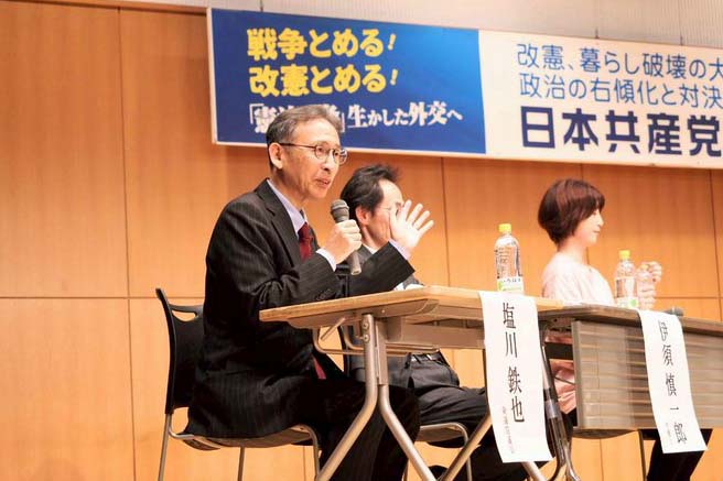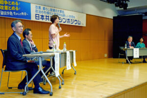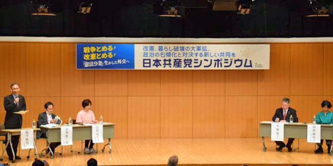 さいたま市浦和区で24日、日本共産党県委員会が平和と憲法をテーマにシンポジウムを開きました。社民党や地域政党の関係者、市民が登壇し、政治の右傾化への懸念を表明。「草の根の共闘の再構築が不可欠だ」との訴えに、会場いっぱいの参加者から拍手が起きました。